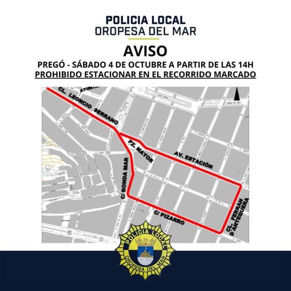 🗣️🏫 El Ayuntamiento de Oropesa del Mar, a través de las concejalías de Fiestas y Policía, recuerda las restricciones al tráfico de esta tarde, Sábado 4 de Octubre, con motivo del recorrido del Pregó.
