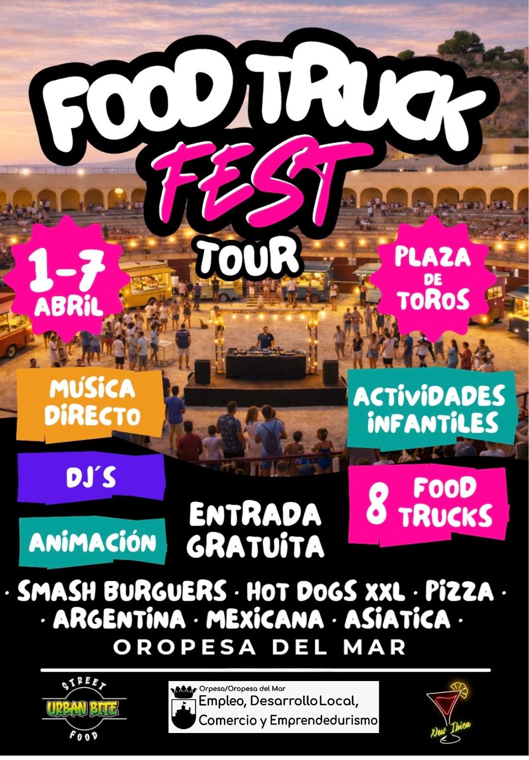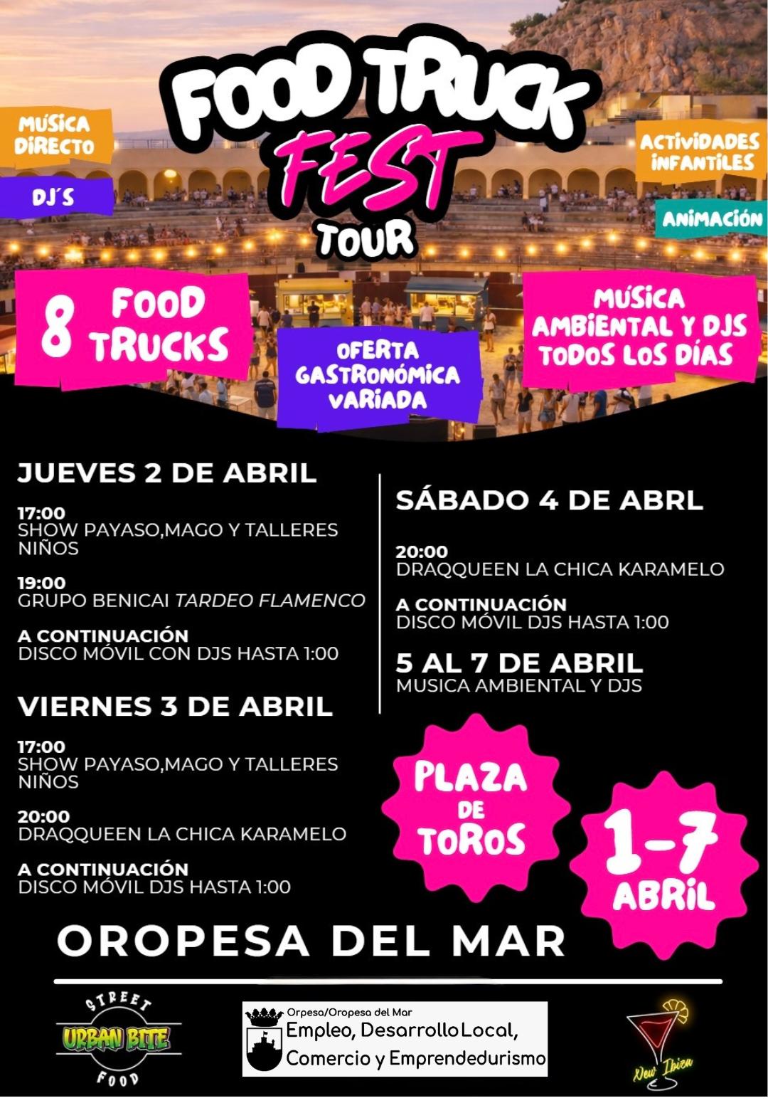 🚚🍔 El Ayuntamiento de Oropesa del Mar informa que la Agencia de Empleo y Desarrollo Local, a través de las concejalías de Comercio y Emprendedores, así como de Cultura, que tendrá lugar la celebración del Festival Gastronómico Food Truck Fest Tour, un evento gastronómico y de ocio que tendrá lugar del 1 al 7 de abril en la Plaza de Toros de nuestro municipio.