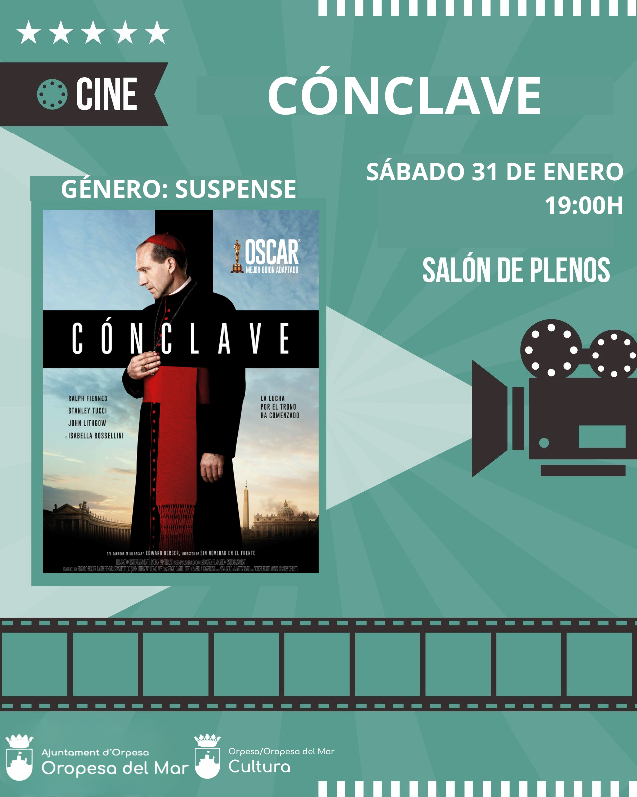 🗣️🏫 El Ayuntamiento de Oropesa del Mar, a través de la concejalía de Cultura, recuerda que hoy Sábado 31 de Enero podremos disfrutar de la sesión de cine semanal con la película "Cónclave".