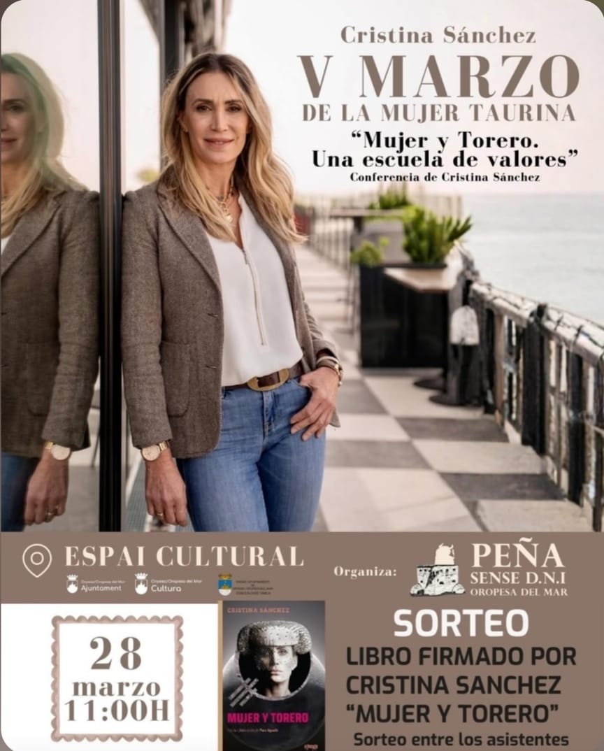 🗣️🏫 El Ayuntamiento de Oropesa del Mar, a través de las concejalías de Familia y Cultura en colaboración con la peña Sense DNI, recuerda que hoy sábado 28 de marzo tendrá lugar la V charla de la Mujer Taurina "Mujer y torero. Una escuela de valores" a cargo de Cristina Sánchez.