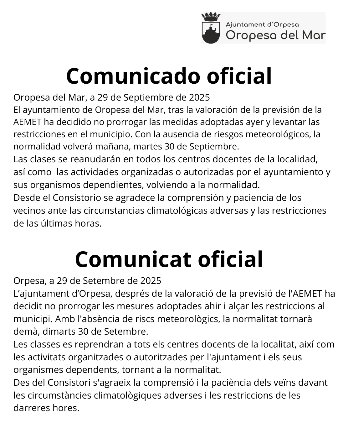 🗣️🏫 El ayuntamiento de Oropesa del Mar informa que tras la valoración de la previsión de la AEMET ha decidido no prorrogar las medidas adoptadas ayer y levantar las restricciones en el municipio.