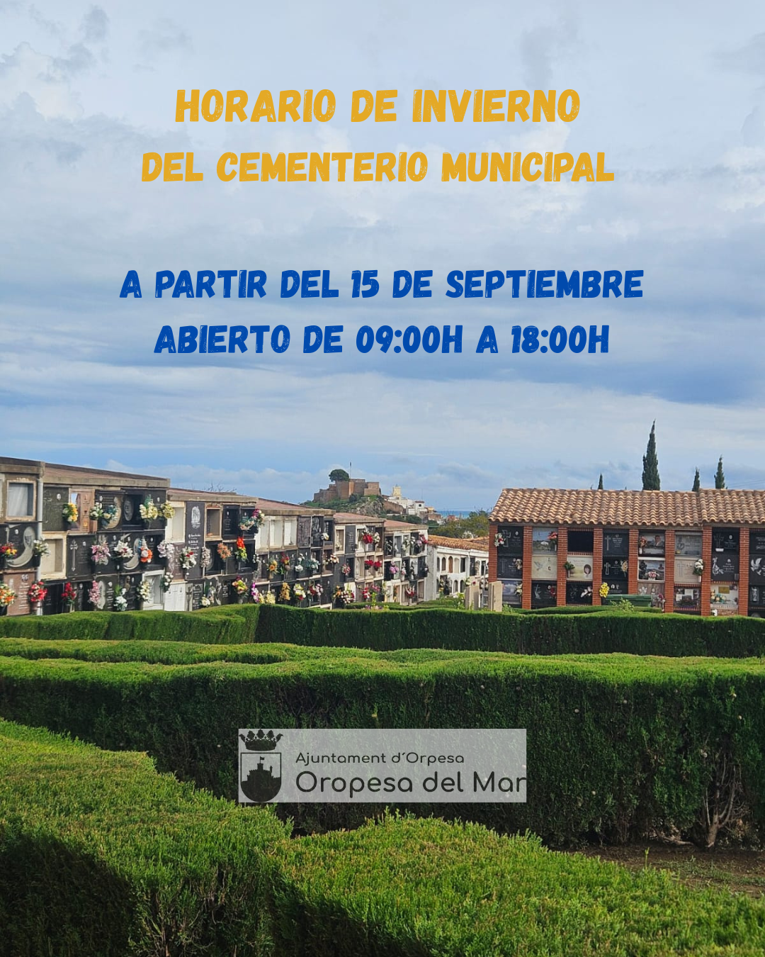 🗣️🏫 L'Ajuntament d'Orpesa, a través de la regidoria de Cementiri, informa que a partir del Dilluns 15 de Setembre el cementiri municipal estarà obert de 09:00 a 18:00h