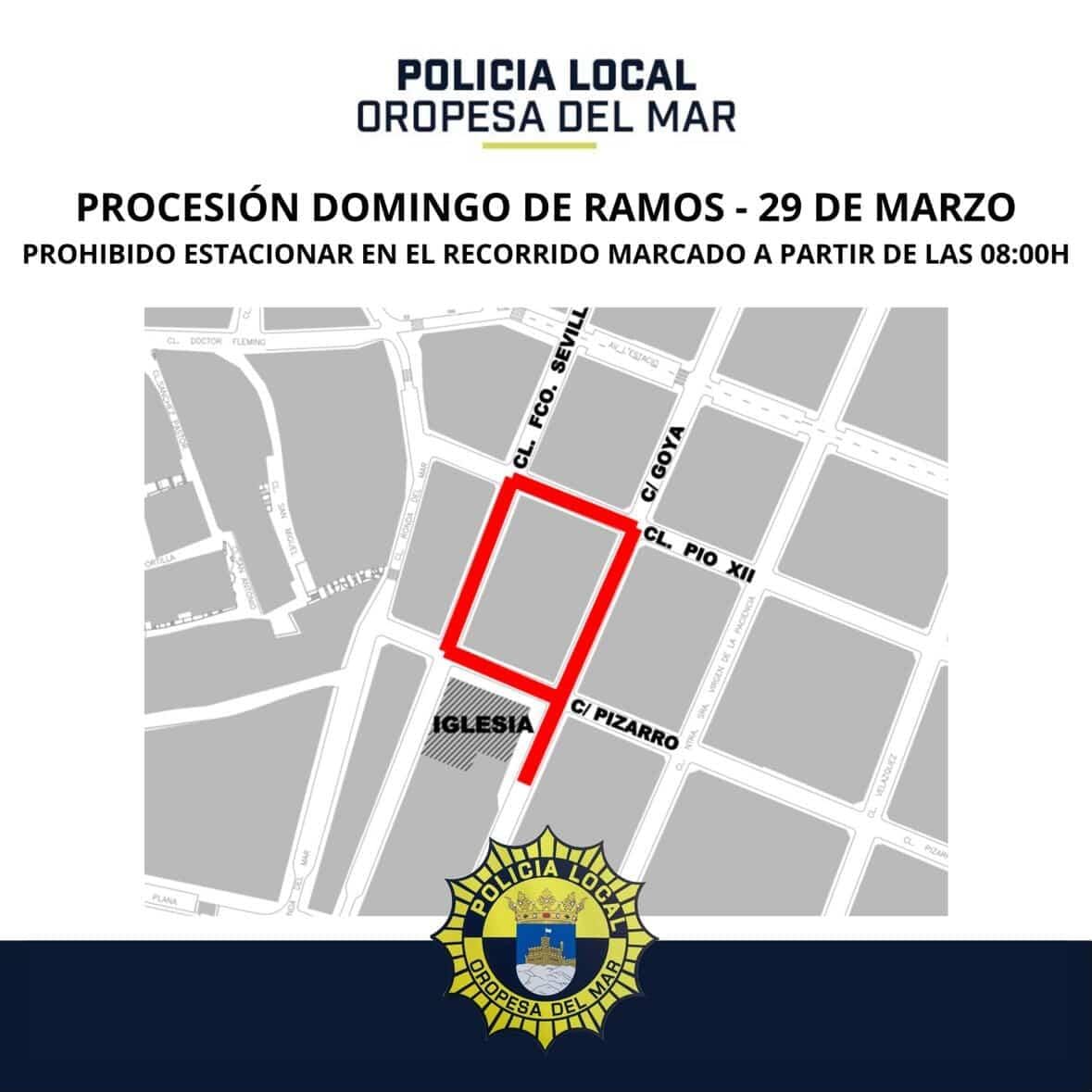 🗣️🏫 El Ayuntamiento de Oropesa del Mar, a través de las concejalías de Fiestas y Policía, informa que este domingo 29 de marzo por la mañana habrá restricciones al tráfico con motivo de la Procesión del Domingo de Ramos.