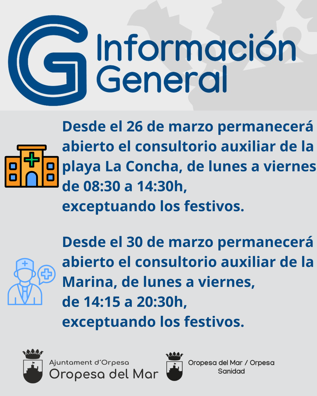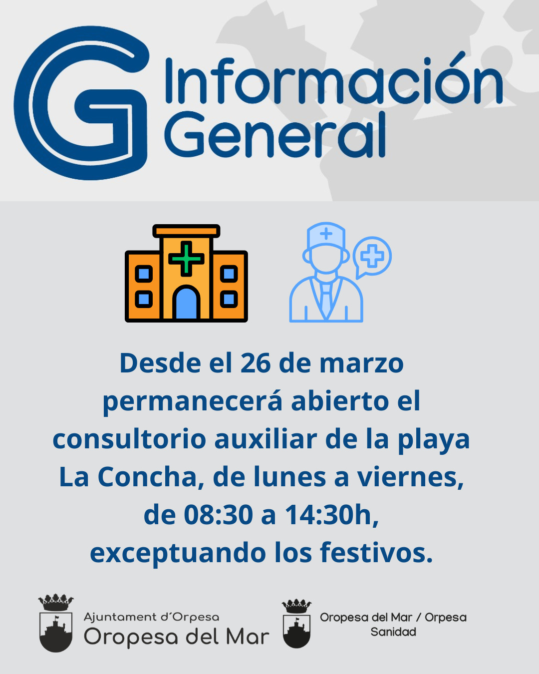 🗣️🏫 El Ayuntamiento de Oropesa del Mar, a través de la concejalía de Sanidad, informa que desde el 26 de marzo permanecerá abierto el consultorio auxiliar de la playa La Concha de forma ininterrumpida desde las 08:30 hasta las 14:30h, de lunes a viernes exceptuando los festivos.