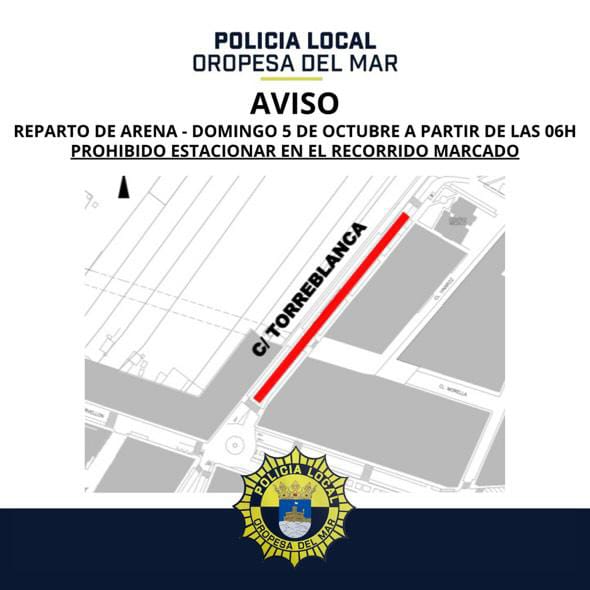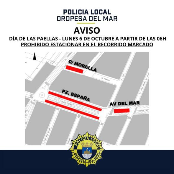 🗣️🏫 El Ayuntamiento de Oropesa del Mar, a través de las concejalías de Fiestas y Policía, informa de las restricciones al tráfico en la calle Torreblanca y la Plaza España para la celebración del Día de Paellas durante las fiestas en honor a la Virgen de la Paciencia este Lunes 6 de Octubre.