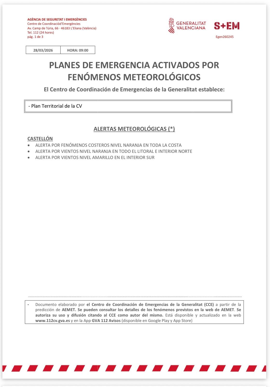 🏫🗣️ El Ayuntamiento de Oropesa del Mar informa que la alerta naranja por fuertes vientos y temporal marítimo estará vigente durante todos el día de hoy y mañana, sábado 28 y domingo 29 de marzo.