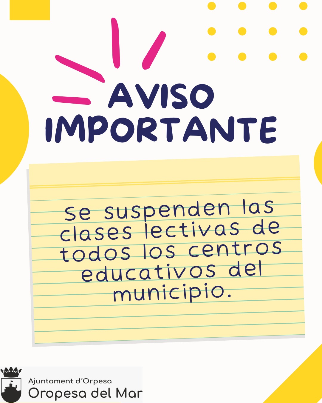 🗣️🏫 L'Ajuntament d'Orpesa informa que aquest Dilluns 29 de Septembre es suspenen les clases lectives a tots els centres educ(...)