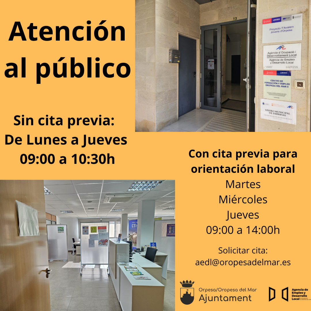 🗣️🏫 El Ayuntamiento de Oropesa del Mar, a través de la concejalía de Empleo, Desarrollo Local, Comercio y Emprendedurismo, junto a la AEDL, informa del nuevo horario de atención al público de forma presencial en las instalaciones de la calle Pío XII nº 13.