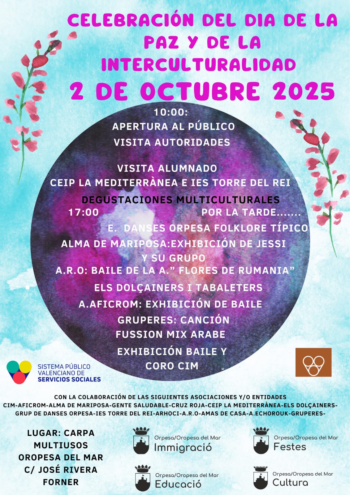 🗣️🏫 L'Ajuntament d'Orpesa, a través de les regidories de Festes i Serveis Socials, informa que el dia 2 d'Octubre celebrarem al Recinte Multiusos el Dia de la Pau i de la Interculturalitat.