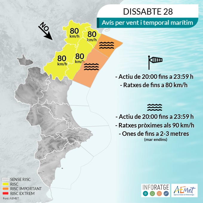 🏫🗣️ L'Ajuntament d'Orpesa informa que l'alerta taronja per forts vents i temporal marítim estarà vigent durant tot el dia d'avui i demà, dissabte 28 i diumenge 29 de març.