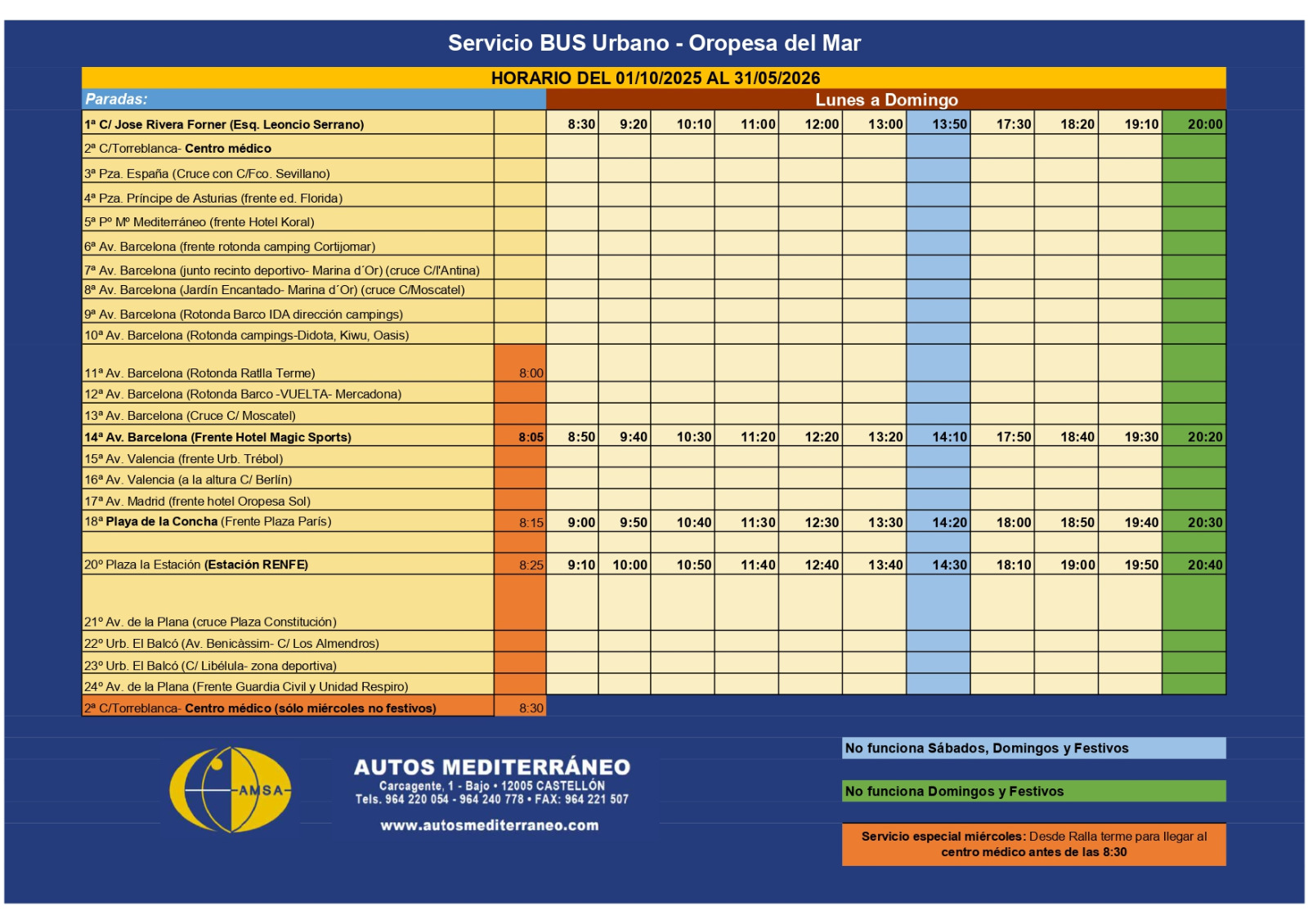 🗣️🏫 El Ayuntamiento de Oropesa del Mar informa que a partir de mañana Miércoles 1 de Octubre cambia el horario del autobús urbano hasta el 30 de Mayo.