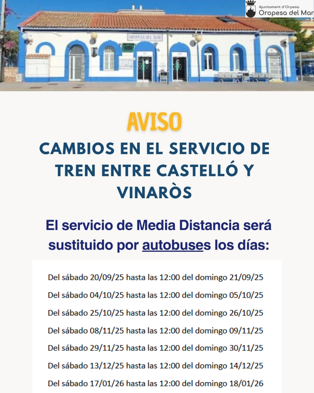 🗣️🏫 El Ayuntamiento de Oropesa del Mar informa de los días que Renfe proporcionará servicio por carretera en autobús, con motivo de las obras de las mejoras en las vías de tren.