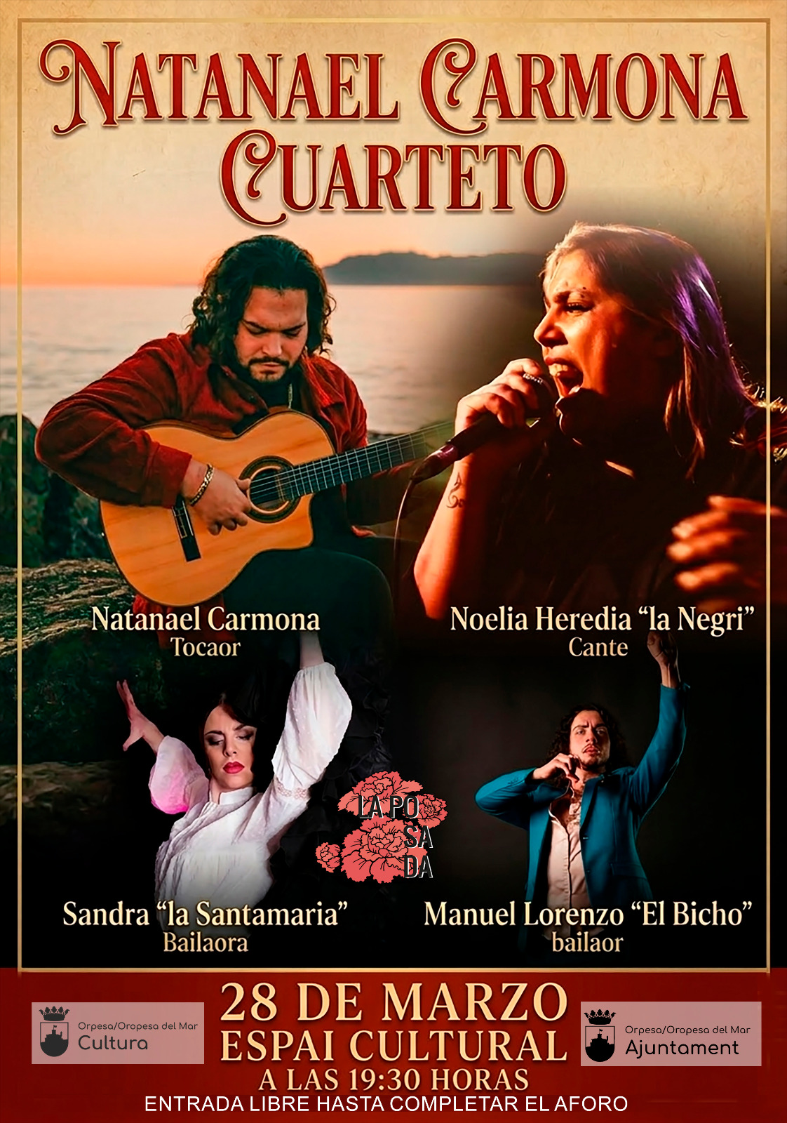 🗣️🏫 El Ayuntamiento de Oropesa del Mar, a través de la concejalía de Cultura con la colaboración de la Asociación cultural flamenca 'La Posada de Avelino', comparte el cartel de la actuación de Flamenco de hoy Sábado 28 de Marzo.
