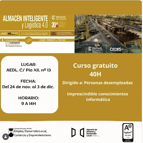 🗣️🏫 El Ayuntamiento de Oropesa del Mar, a través de la concejalía de Empleo, Desarrollo Local, Comercio y Emprendedurismo, junto a la AEDL, informa del curso gratuito "Almacén inteligente y logística 4.0" dirigido a personas desempleadas.