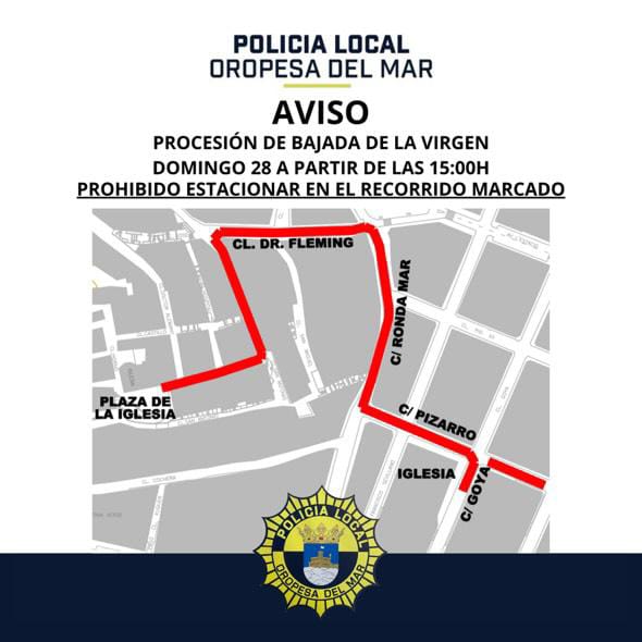 🗣️🏫 El Ayuntamiento de Oropesa del Mar, a través de las concejalías de Fiestas y Policía, informa del recorrido de la Procesión de bajada de la Patrona del municipio de este Domingo 28 de Septiembre.