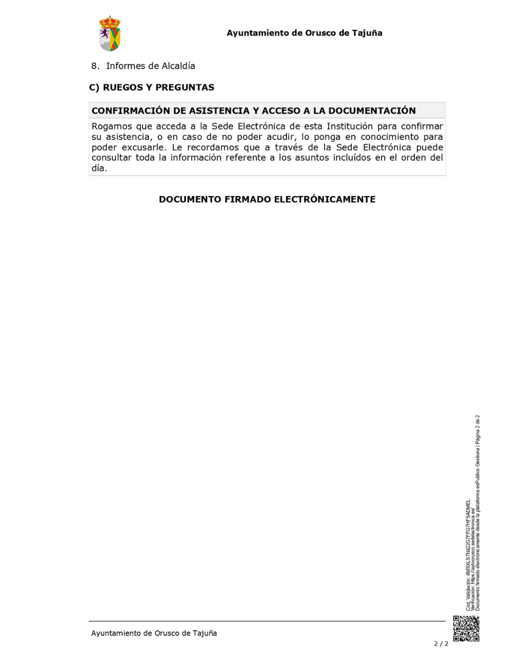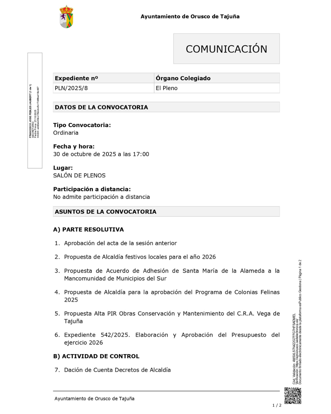 Convocado un Pleno Ordinario del Ayuntamiento de Orusco de Tajuña para este jueves, 30 de octubre, con los puntos que figuran en la convocatoria.