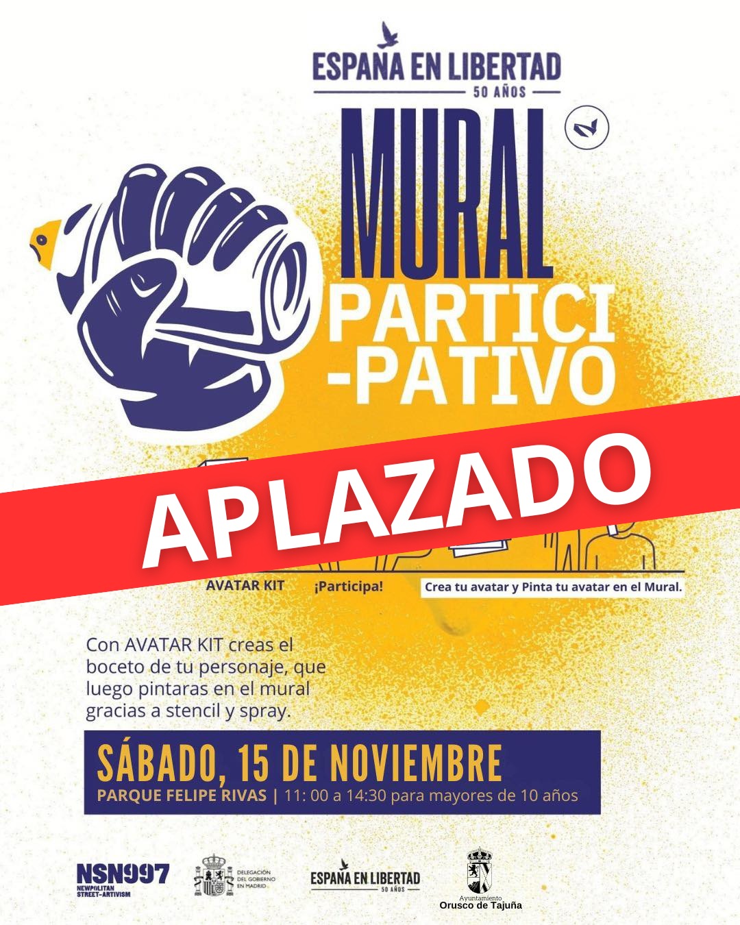 Debido a la previsión meteorológica adversa, el mural participativo programado para el sábado 15 de noviembre se traslada al sábado 29 de noviembre. La actividad se llevará a cabo en esa fecha con el mismo horario previsto inicialmente.