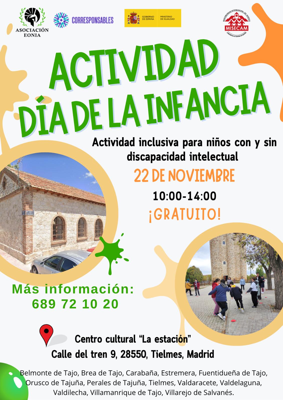 Para celebrar el Día Internacional de los Derechos de los Niños y las Niñas, MISECAM organiza una actividad inclusiva y gratuita dirigida a niños y niñas con y sin discapacidad intelectual. La jornada tendrá lugar el 22 de noviembre, de 10:00 a 14:00 horas, en el Centro Cultural 'La Estación' de Tielmes.