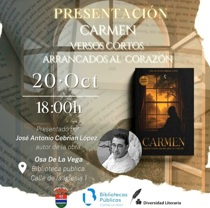 Hoy, 20 de octubre, en la Biblioteca de Osa de la Vega, nos visita el escritor José Antonio Cebrián para presentarnos su nuevo libro "Carmen".