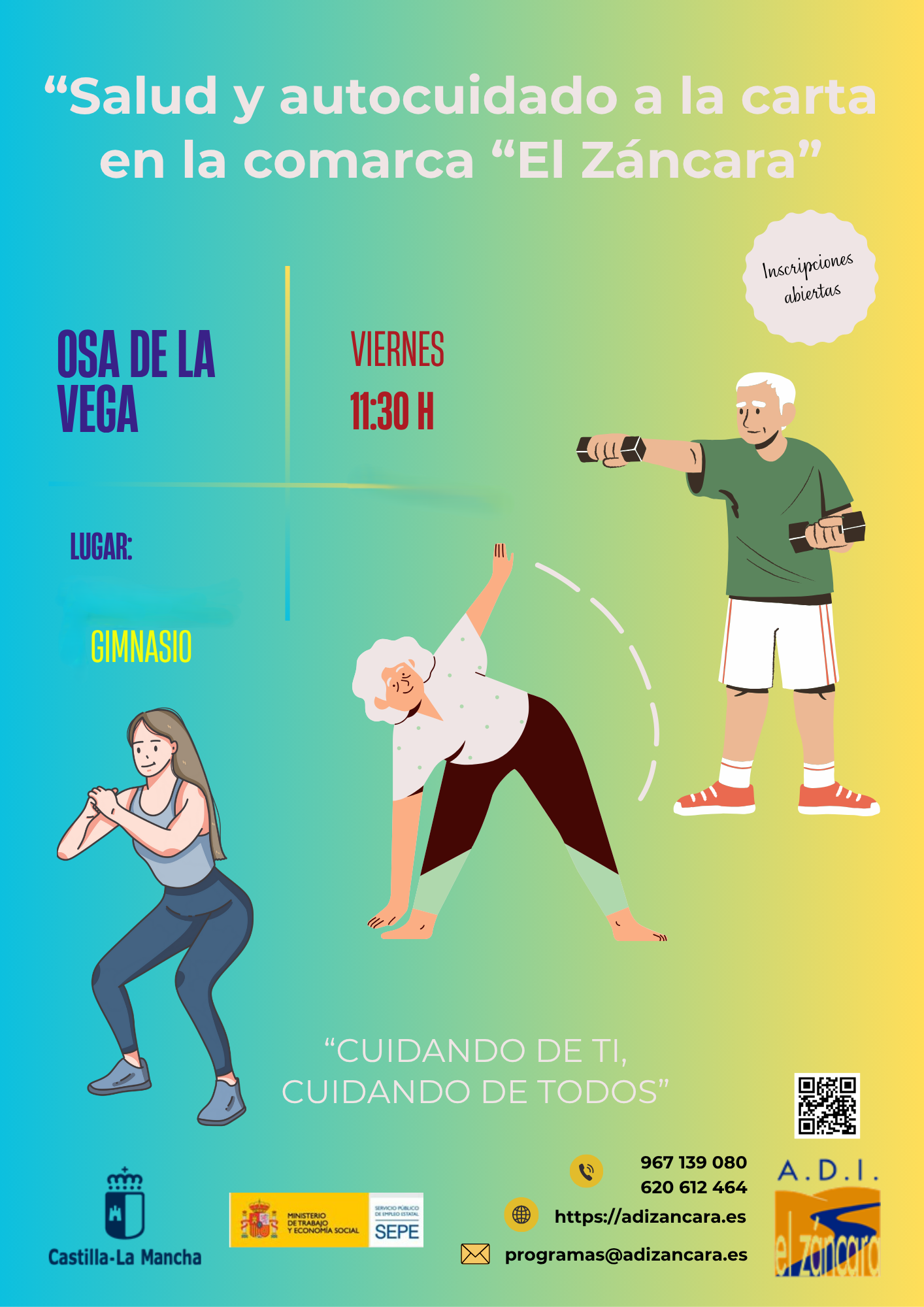 🗓️ El viernes 24 de octubre a las 11:30 h 🕥 darán comienzo en el 🏋️♀️ gimnasio del polideportivo de Osa de la Vega las actividades del proyecto del A.D.I. El Záncara 💚 “Salud y autocuidado a la carta en la comarca El Záncara” 🌿✨