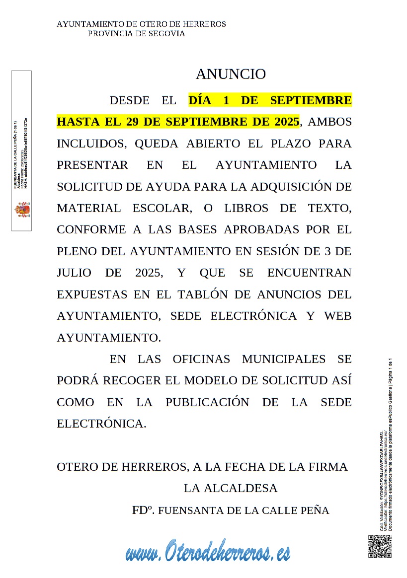 Queda abierto el plazo para presentar en el ayuntamiento la solicitud de ayuda para la adquisición del material escolar, o libros de texto, conforme a las bases aprobadas por el pleno del ayuntamiento en sesión de 3 de Julio de 2025, y que se encuentran expuestas en el tablón de anuncios del ayuntamiento, sede electrónica y web ayuntamiento.