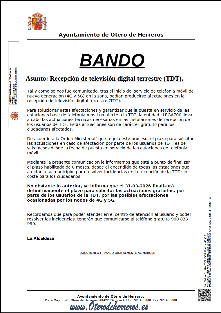 Tal y como se nos fue comunicado, tras el inicio del servicio de telefonía móvil de nueva generación (4G y 5G) en la zona, podían producirse afectaciones en la recepción de televisión digital terrestre (TDT).