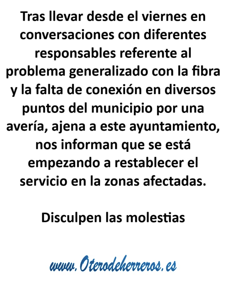 Tras llevar desde el viernes en conversaciones con diferentes responsables referente al problema generalizado con la fibra y la falta de conexión en diversos puntos del municipio por una avería, ajena a este ayuntamiento, nos informan que se está empezando a restablecer el servicio en la zonas afectadas.