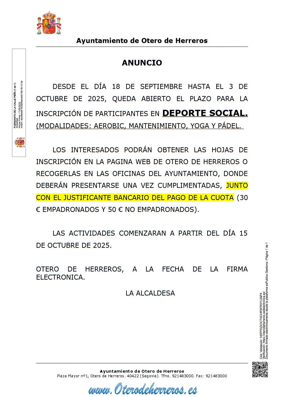 LOS INTERESADOS PODRÁN OBTENER LAS HOJAS DE INSCRIPCIÓN EN LA PAGINA WEB DE OTERO DE HERREROS O RECOGERLAS EN LAS OFICINAS DEL AYUNTAMIENTO, DONDE DEBERÁN PRESENTARSE UNA VEZ CUMPLIMENTADAS, JUNTO CON EL JUSTI(...)