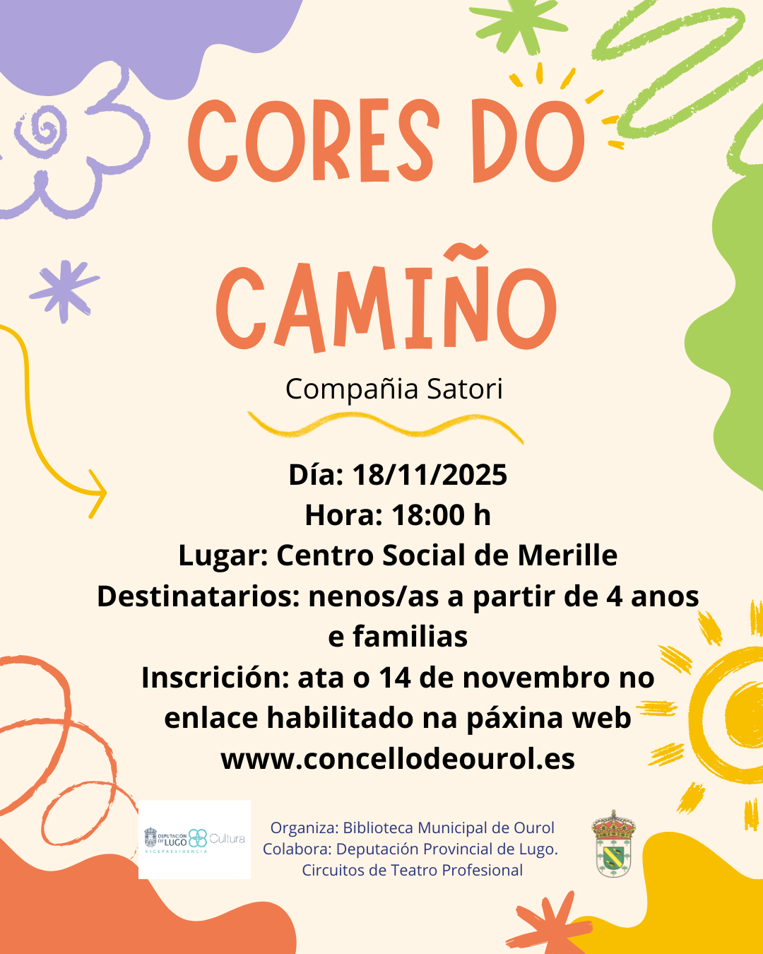 O vindeiro día 18 de novembro ás 18:00 h no Centro Social de Merille teremos a representación da obra Cores do Camiño da compañía de teatro Satori. Será para nenos/as a partir de 4 anos e familias.