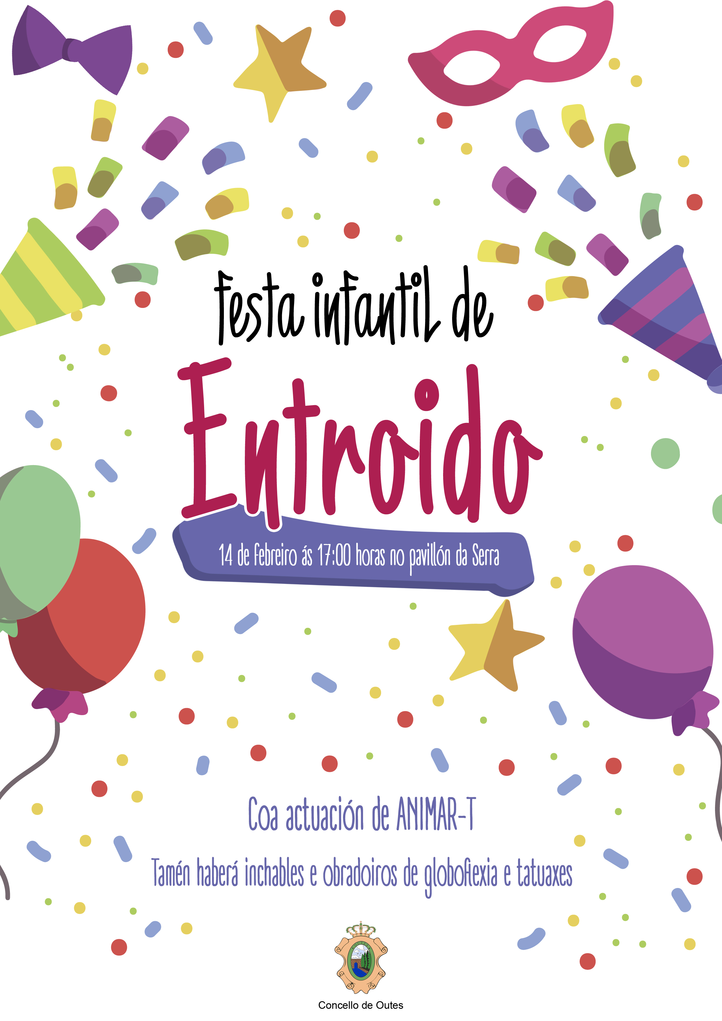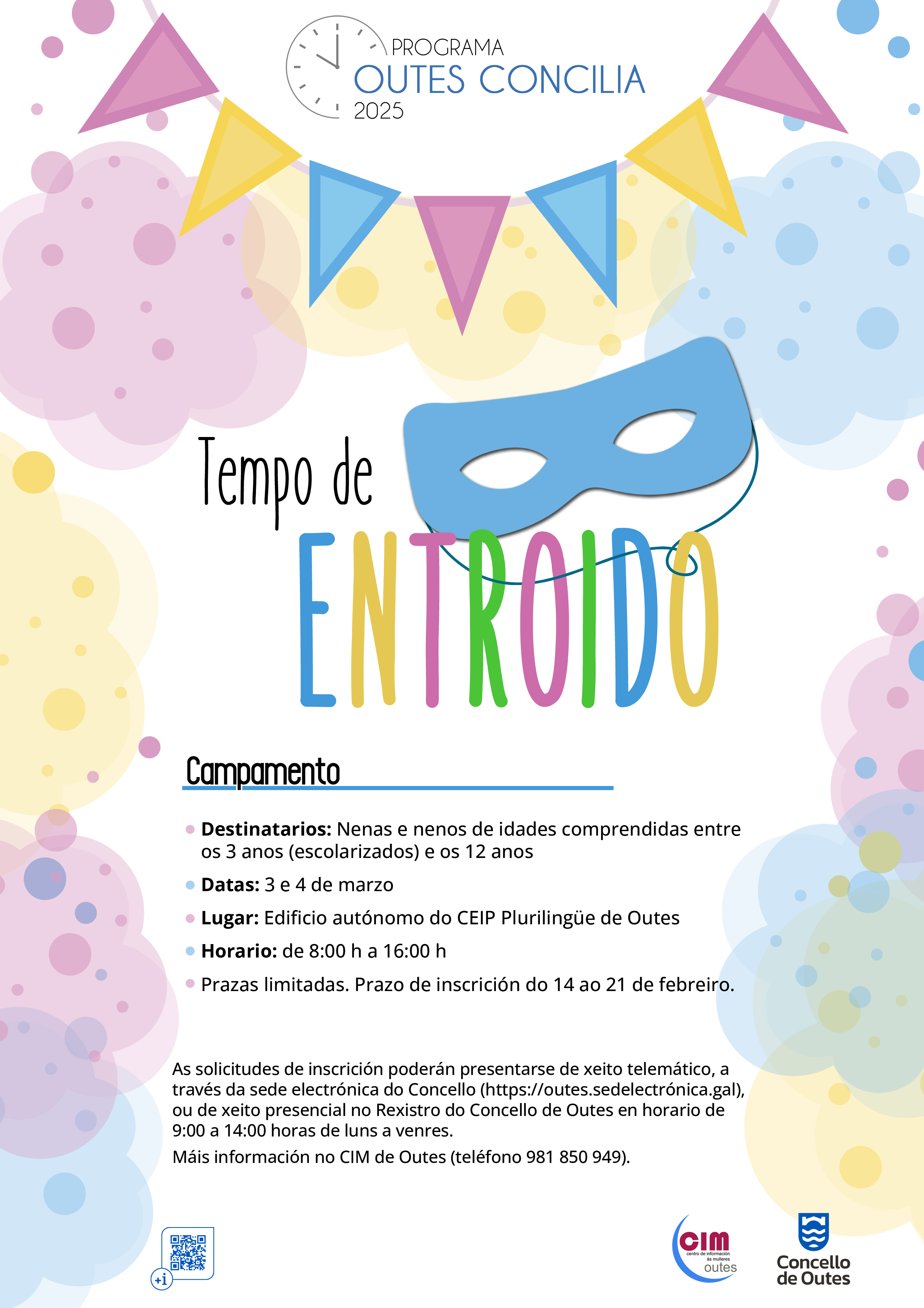 Lembrade que o venres, 30 de xaneiro, remata o prazo de inscrición no servizo de conciliación TEMPO DE ENTROIDO 2026, que se desenvolverá os días 16 e 17 de febreiro, no edificio autónomo do CEIP Plurilingüe de Outes . Máis información na web do Concello de Outes: