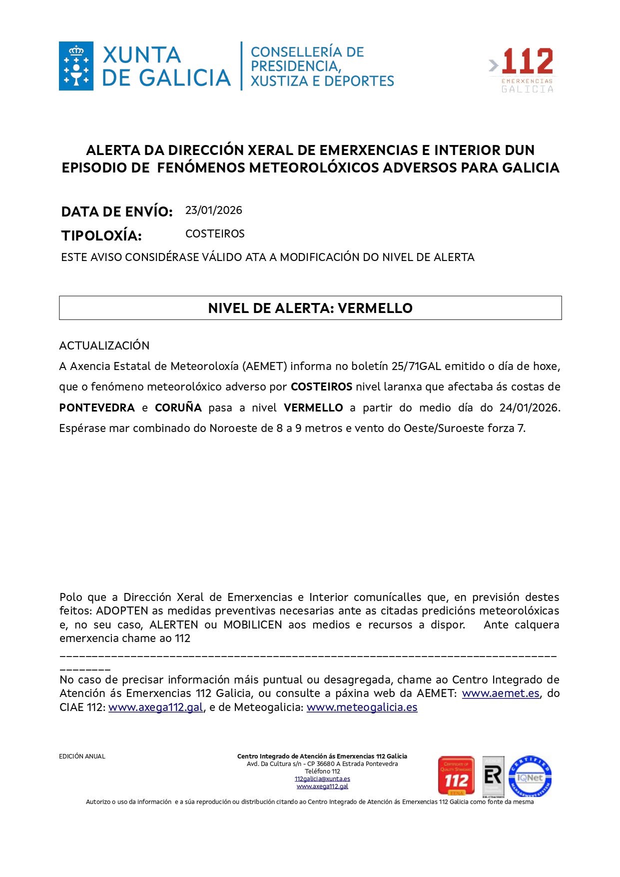 A Axencia Estatal de Meteoroloxía (AEMET) informa no boletín 25/71GAL emitido o día de hoxe, que o fenómeno meteorolóxico adverso por COSTEIROS nivel laranxa que afectaba ás costas de PONTEVEDRA e CORUÑA pasa a nivel VERMELLO a partir do medio día do 24/01/2026.