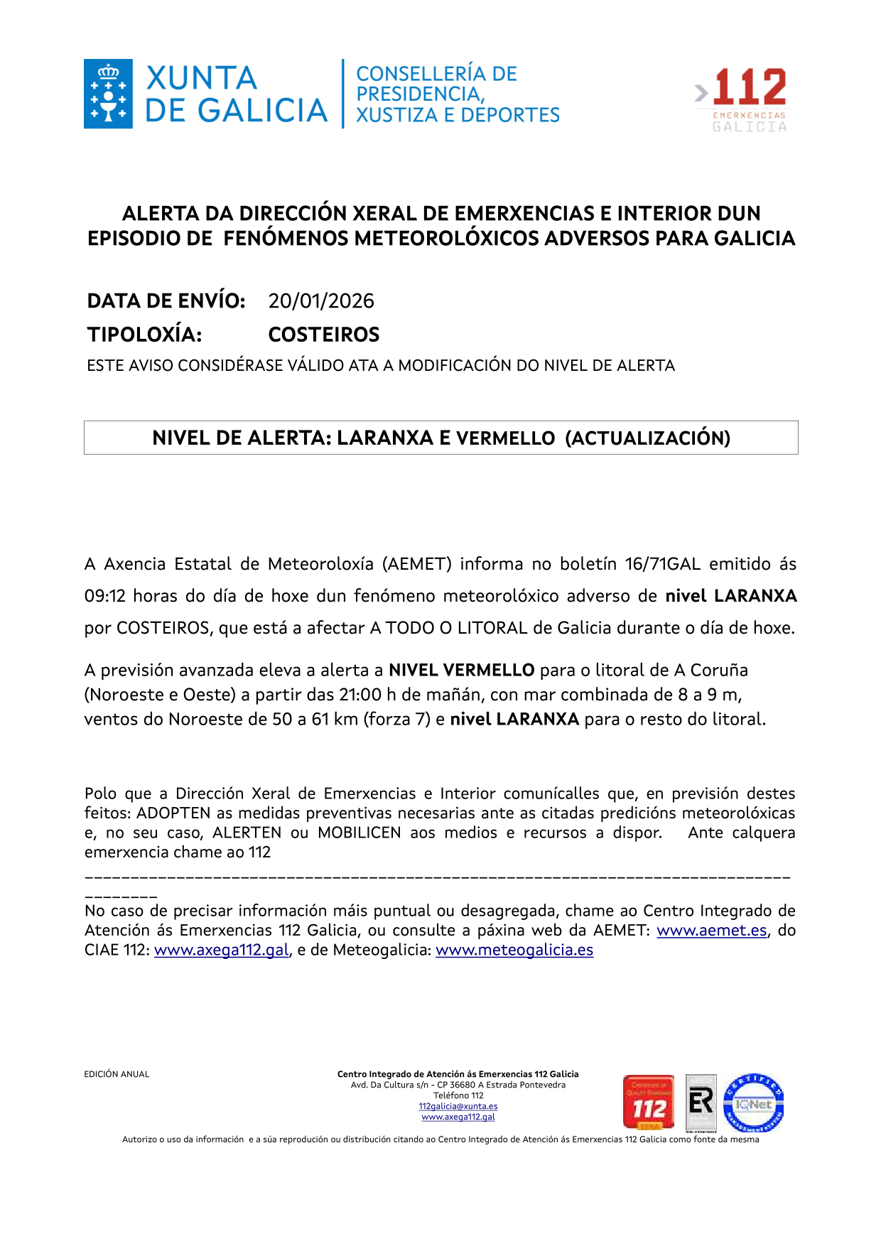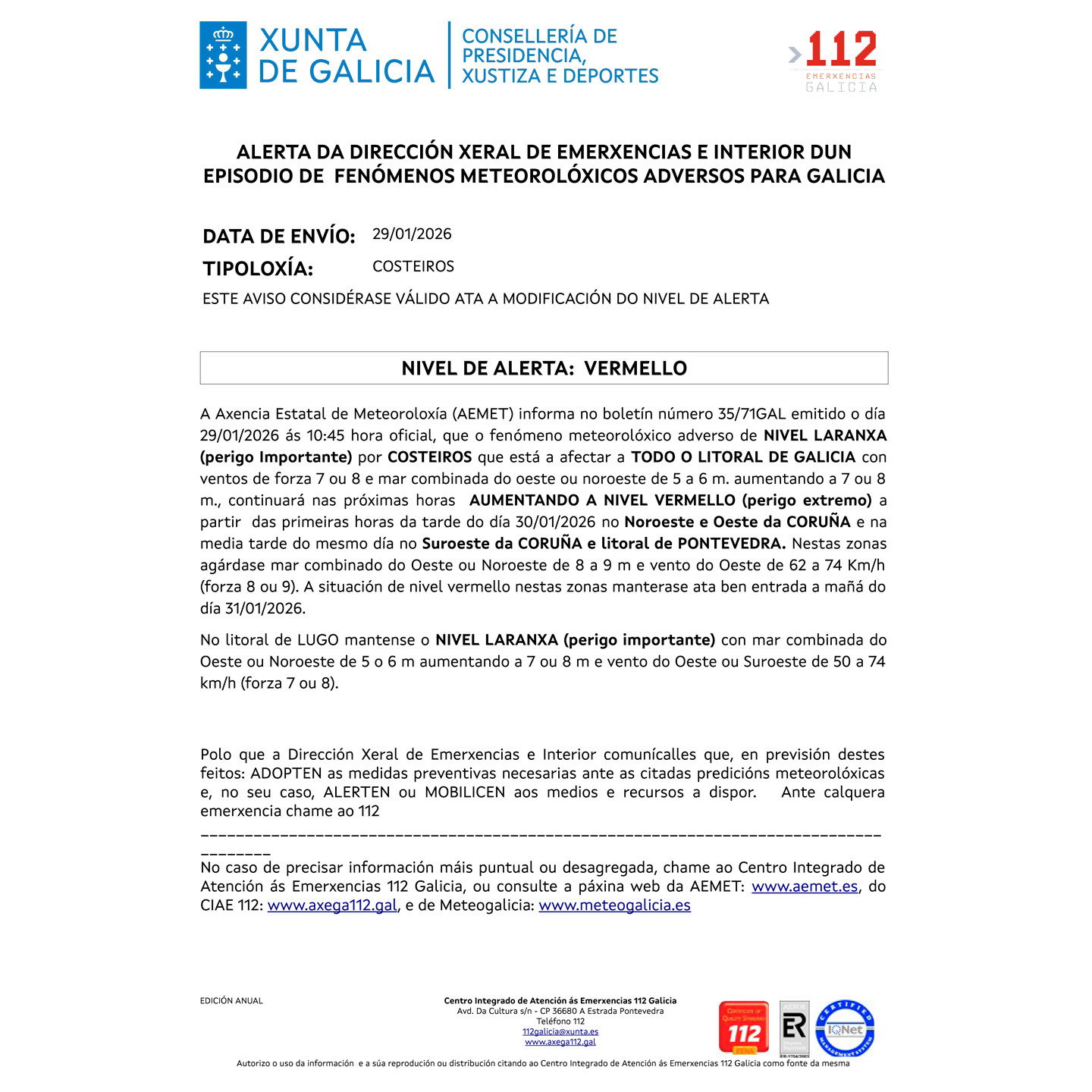 A Axencia Estatal de Meteoroloxía (AEMET) informa dun episodio de fenómenos meteorolóxicos adversos para Galicia. Actualmente está activado o NIVEL LARANXA por ventos de forza 7 ou 8, que continuará nas próximas horas e que AEMET prevé que aumente a NIVEL VERMELLO (perigo extremo) a partir das primeiras horas da tarde do venres, 30 de xaneiro de 2026.