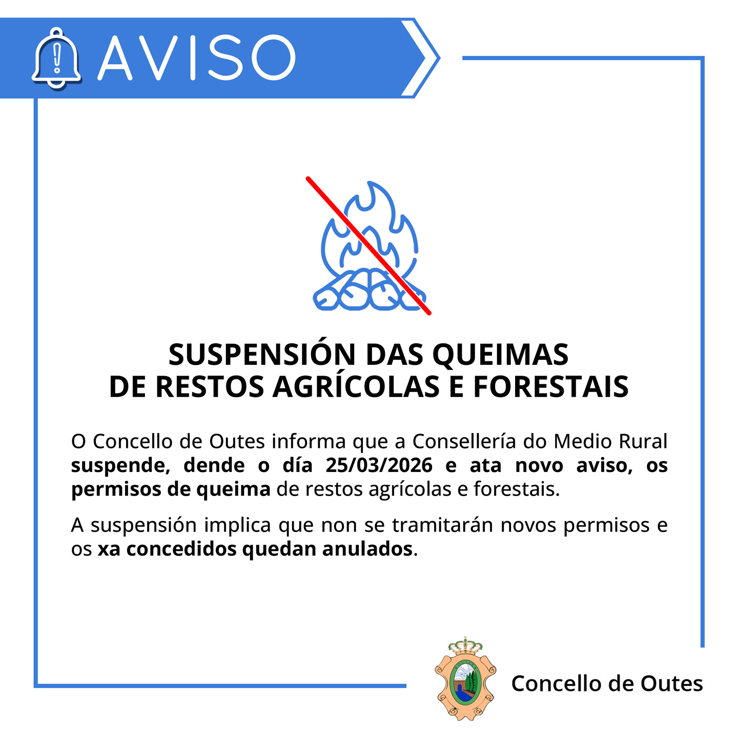 O Concello de Outes informa que a Consellería do Medio Rural suspende, dende o día 25/03/2026 e ata novo aviso, os permisos de queima de restos agrícolas e forestais.