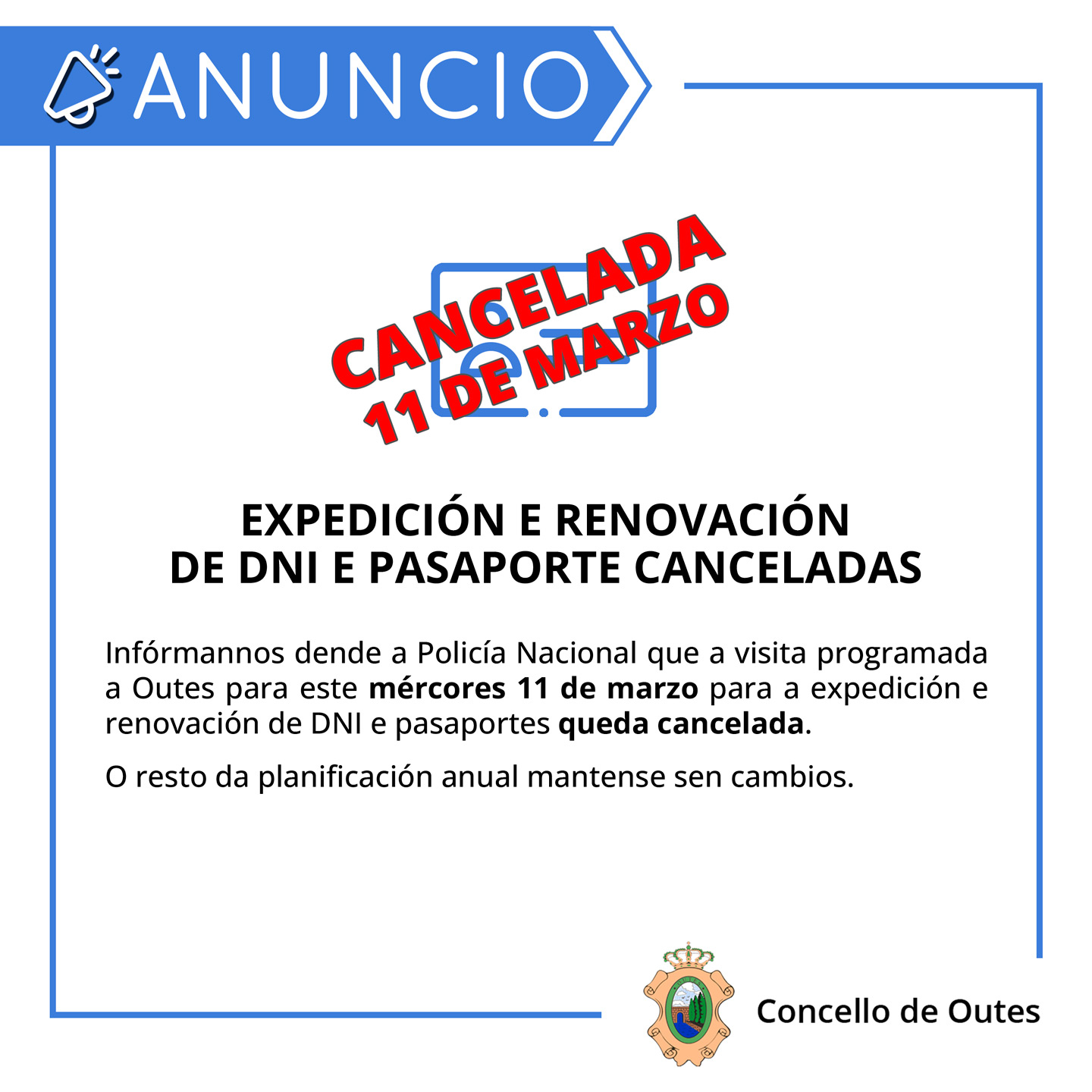 EXPEDICIÓN E RENOVACIÓN DE DNI E PASAPORTE CANCELADAS