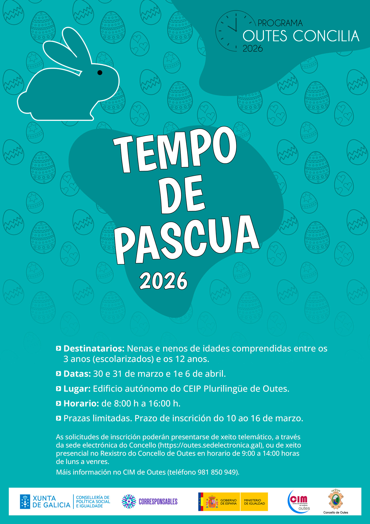 O Concello de Outes, a través do CIM (Centro de Información ás Mulleres), ofrécelles ás familias con menores de idades comprendidas entre os 3 anos (escolarizados) e os 12 anos o servizo de conciliación “Tempo de Pascua 2026”, que forma parte do programa “Outes Concilia”.