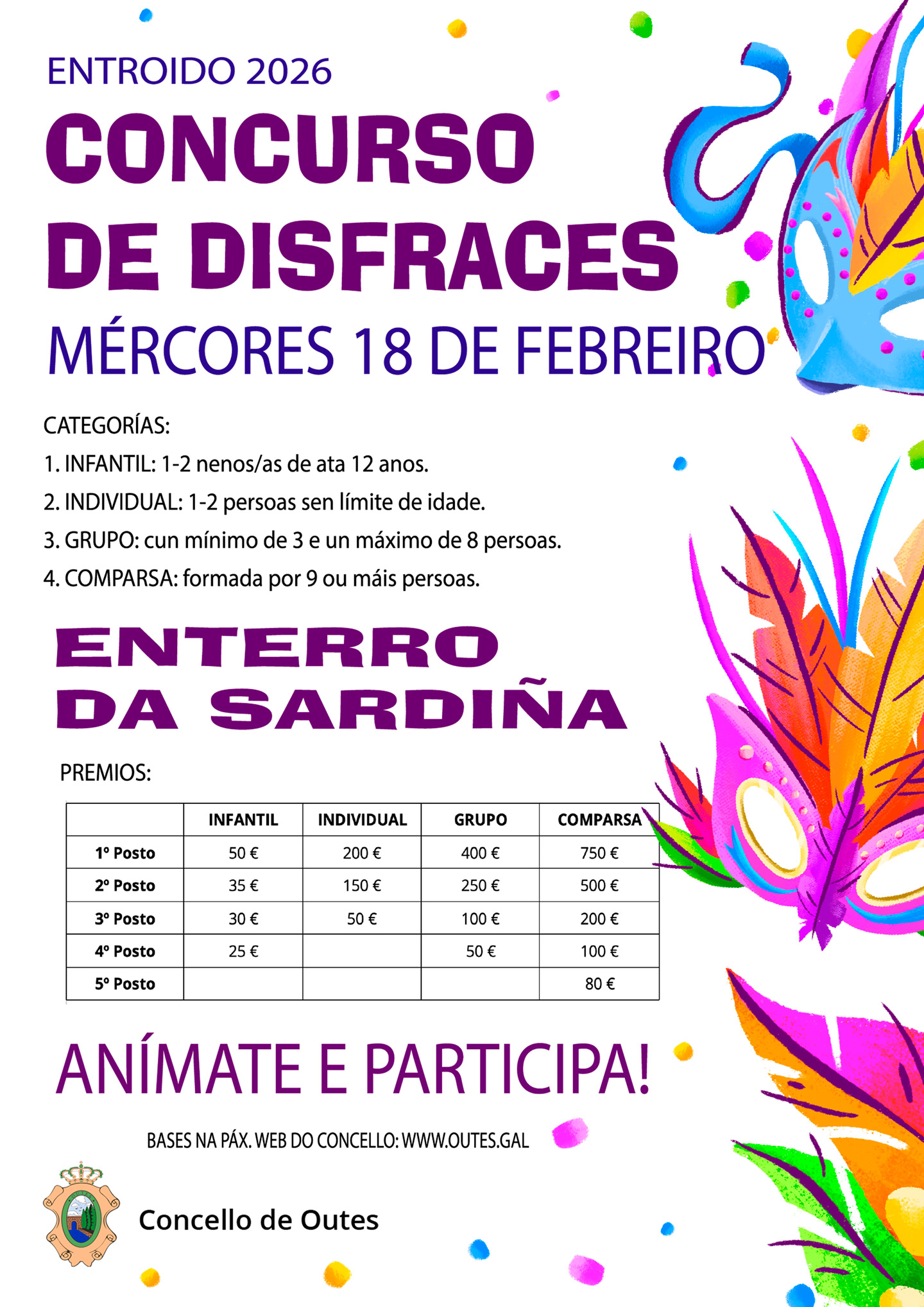 O mércores 18 de febreiro celebraremos en Outes o tradicional Enterro da Sardiña, co concurso de disfraces, que terá lugar a partir das 17:00 horas na praza de Galicia ou, en caso de que chova, no pavillón polideportivo.