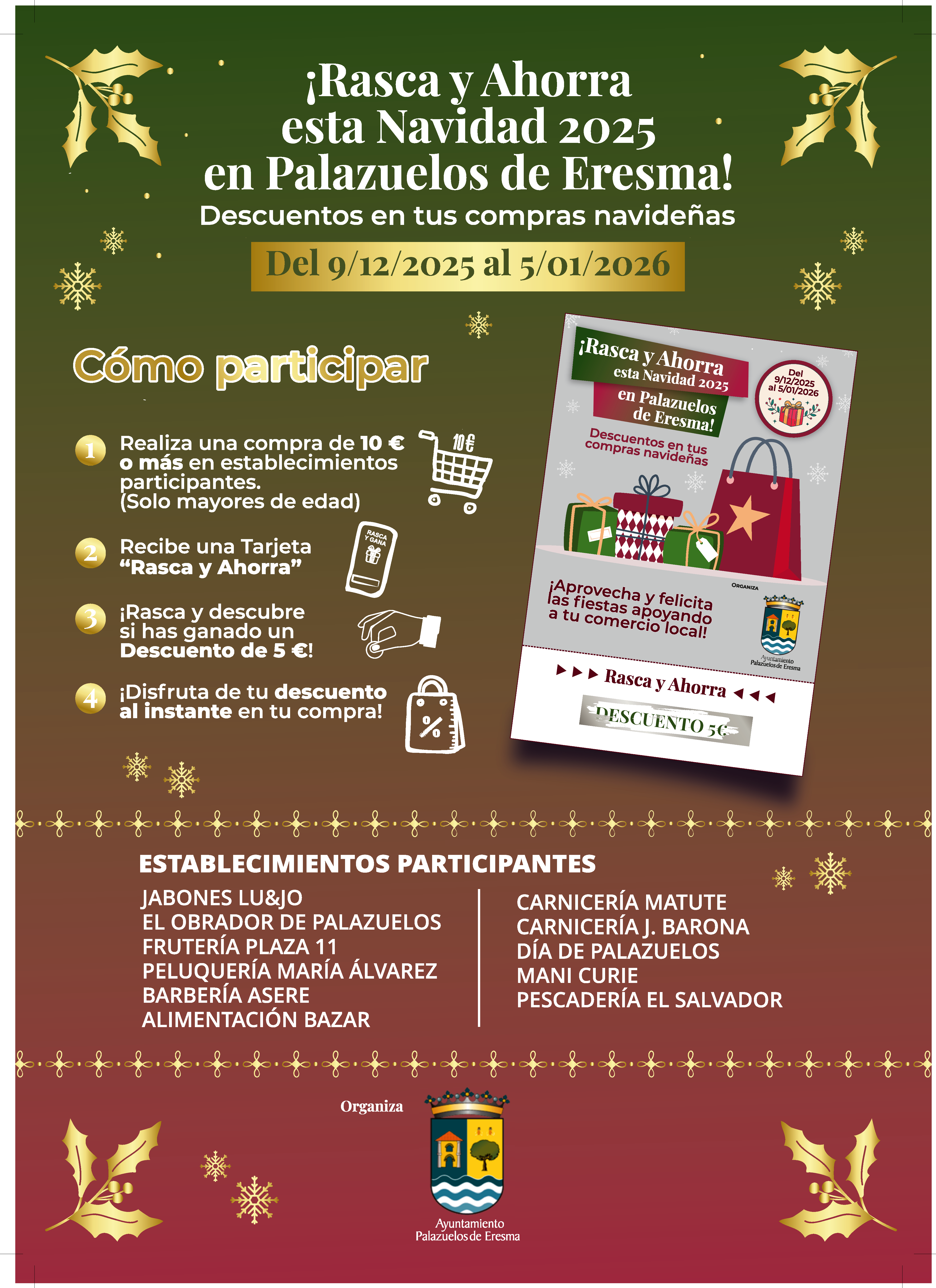 Desde la Concejalía de Promoción Económica y la Agencia de Desarrollo Local del Ayuntamiento de Palazuelos de Eresma, te invitamos a participar en la campaña Navidad “Rasca y Ahorra 2025”, una iniciativa pensada para impulsar las compras en el comercio y servicios de proximidad durante la Navidad.