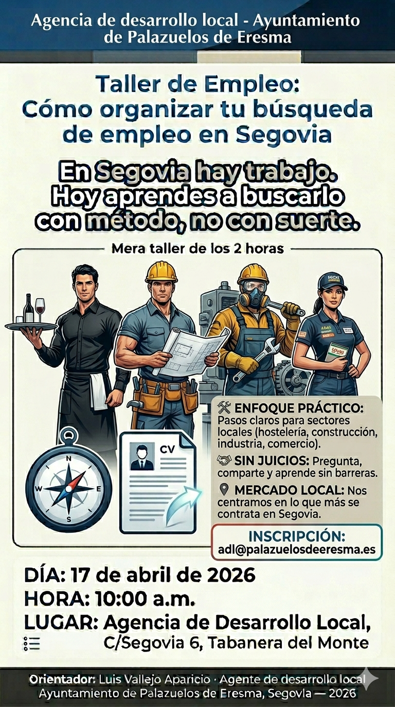 Por eso, desde la Agencia de desarrollo local del Ayuntamiento de Palazuelos de Eresma hemos organizado un taller gratuito y práctico para ayudarte a conseguir resultados reales.Taller: Cómo organizar tu búsqueda de empleo en Segovia