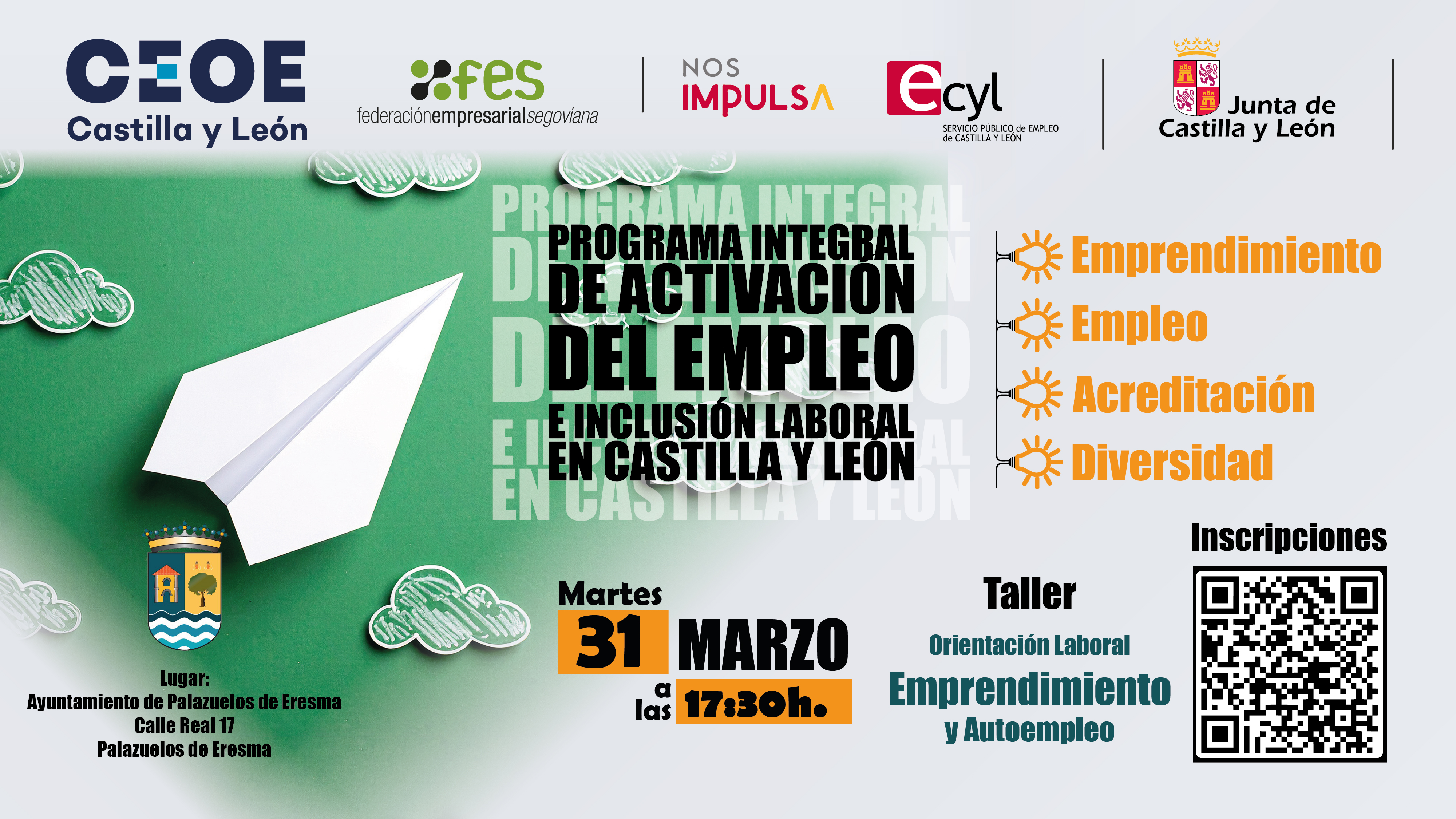 La Agencia de Desarrollo Local del Ayuntamiento de Palazuelos de Eresma te invita a participar en su taller de orientación laboral, dentro de la agenda formativa de marzo. Esta sesión, impartida por la FES, está dirigida a personas interesadas en el emprendimiento y el autoempleo como vía para crear su propio puesto de trabajo.📅 Información del taller