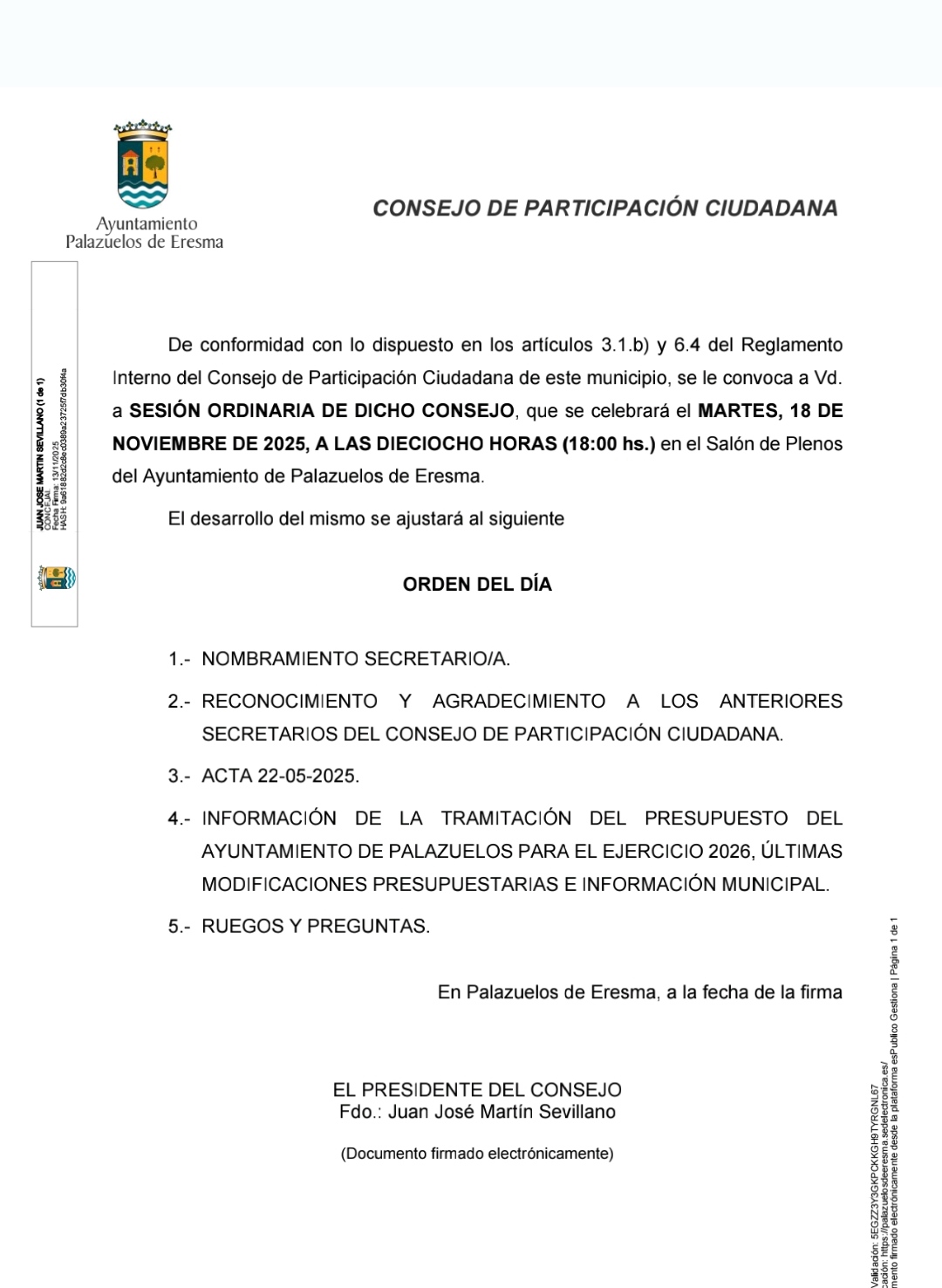 El Consejo de Participación Ciudadana le convoca a una Sesión Ordinaria que tendrá lugar el martes 18 de noviembre de 2025 a las 18:00 horas, en el Salón de Plenos del Ayuntamiento.