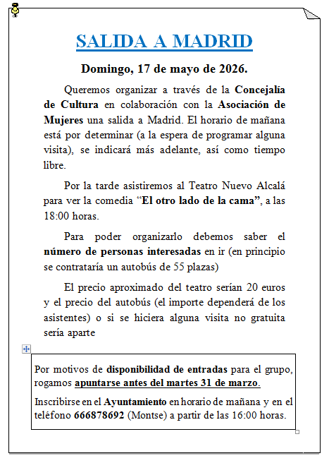 Debido a los días de Semana Santa se amplía el plazo para apuntarse a la salida del 17 de mayo a Madrid. -