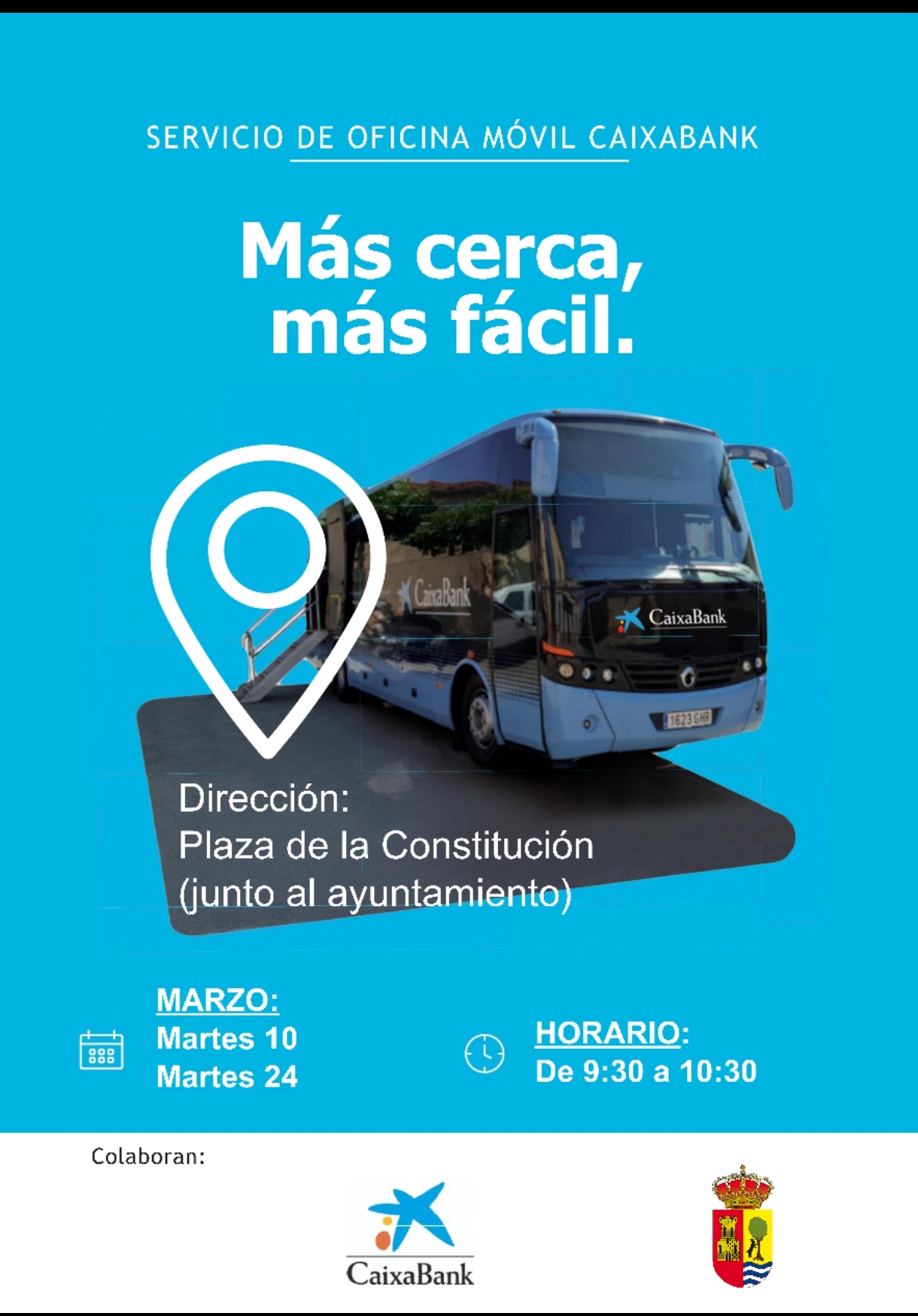 La ofimóvil de CaixaBank da servicio (en la plaza de la Constitución, junto al ayuntamiento) las siguientes mañanas del mes de marzo: martes 10 y 24 (9:30-10:30h).