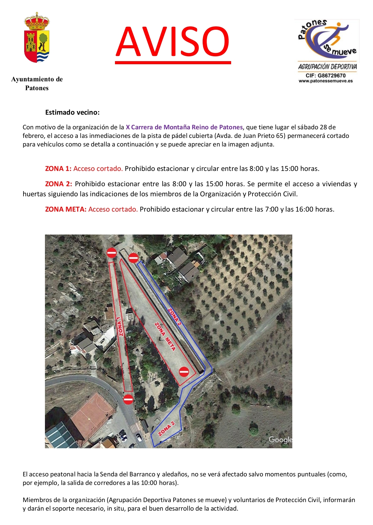 Con motivo de la organización de la X Carrera de Montaña Reino de Patones, que tiene lugar el sábado 28 de febrero, no se podrá acceder en vehículo a los aledaños de la pista de pádel (avda. Juan Prieto 65) entre las 7:00 y 16:00 horas.