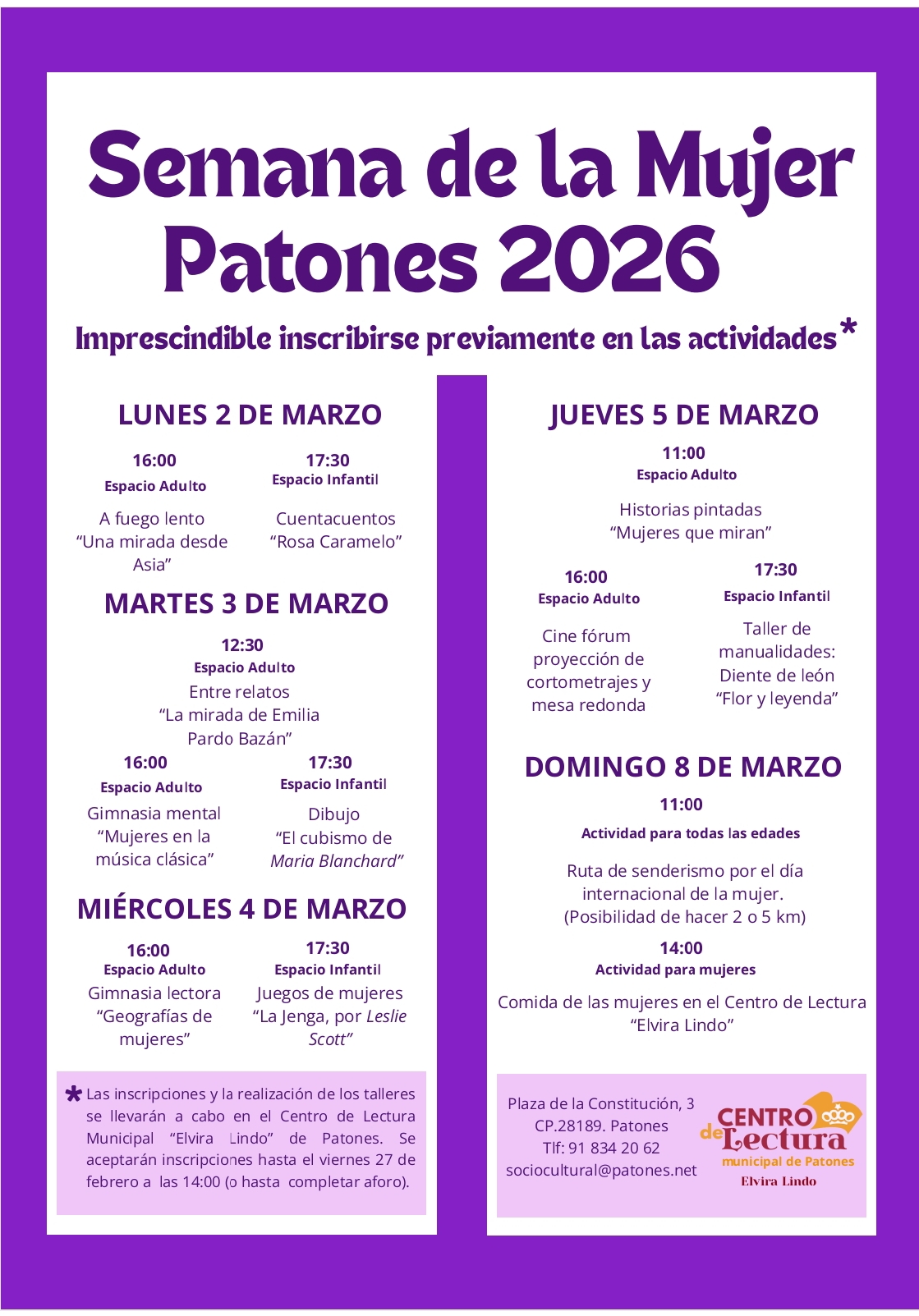 ✍🏻 Imprescindible inscripción, in situ, en el centro de lectura 'Elvira Lindo', por 📨 sociocultural@patones.net o 📞918432062.