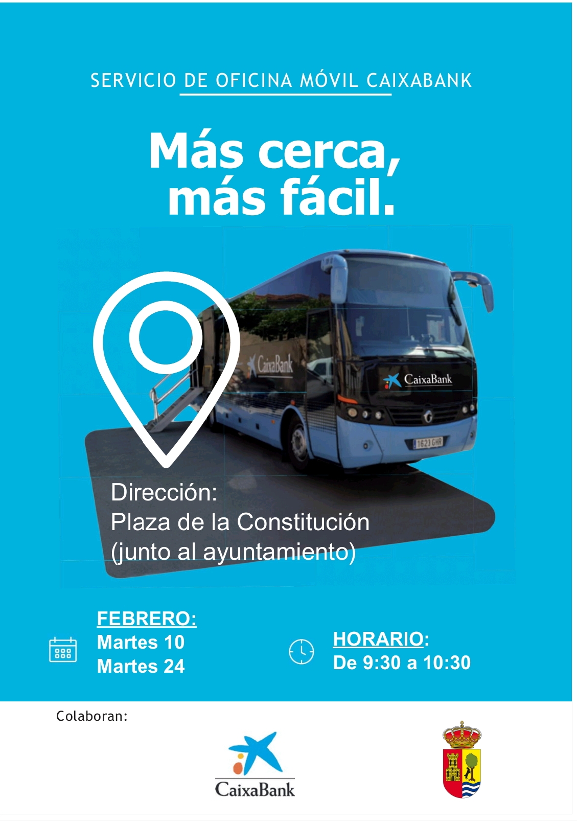 La ofimóvil de CaixaBank da servicio (en la plaza de la Constitución, junto al ayuntamiento) las siguientes mañanas del mes de febrero: martes 10 y 24 (9:30-10:30h).