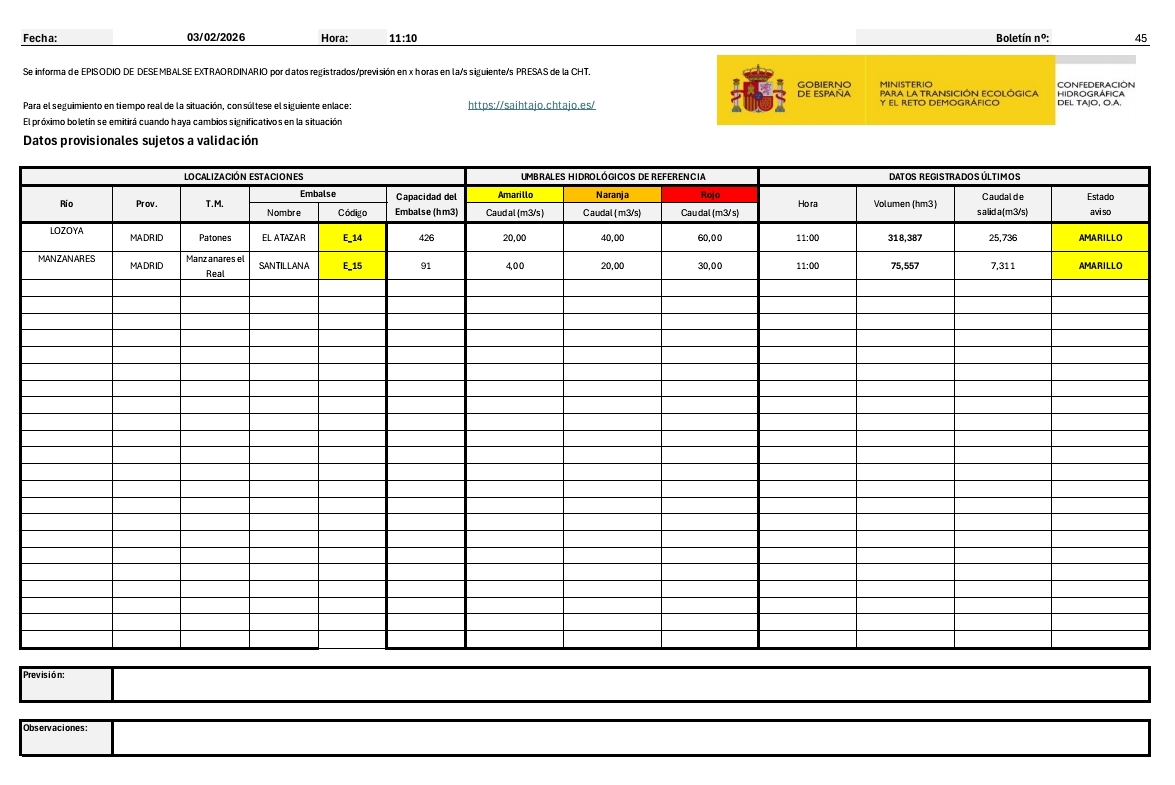 Buenas tardes, se informa a los vecinos de los desembalses de agua de nuestra comunidad por el momento. Presa de Pedrezuela: Se esta vertiendo un caudal de 8 m3/s. Presa de Pinilla: Se esta vertiendo un caudal de 15 m3/s. Se aumenta a 25 m3/s Presa de Riosequillo: Se esta vertiendo un caudal de 17 m3/s. Presa de Puentes Viejas: Se esta vertiendo un caudal de 50 m3/s. Presa de El Vado: Se comienza a verter un caudal de 15 m3/s.