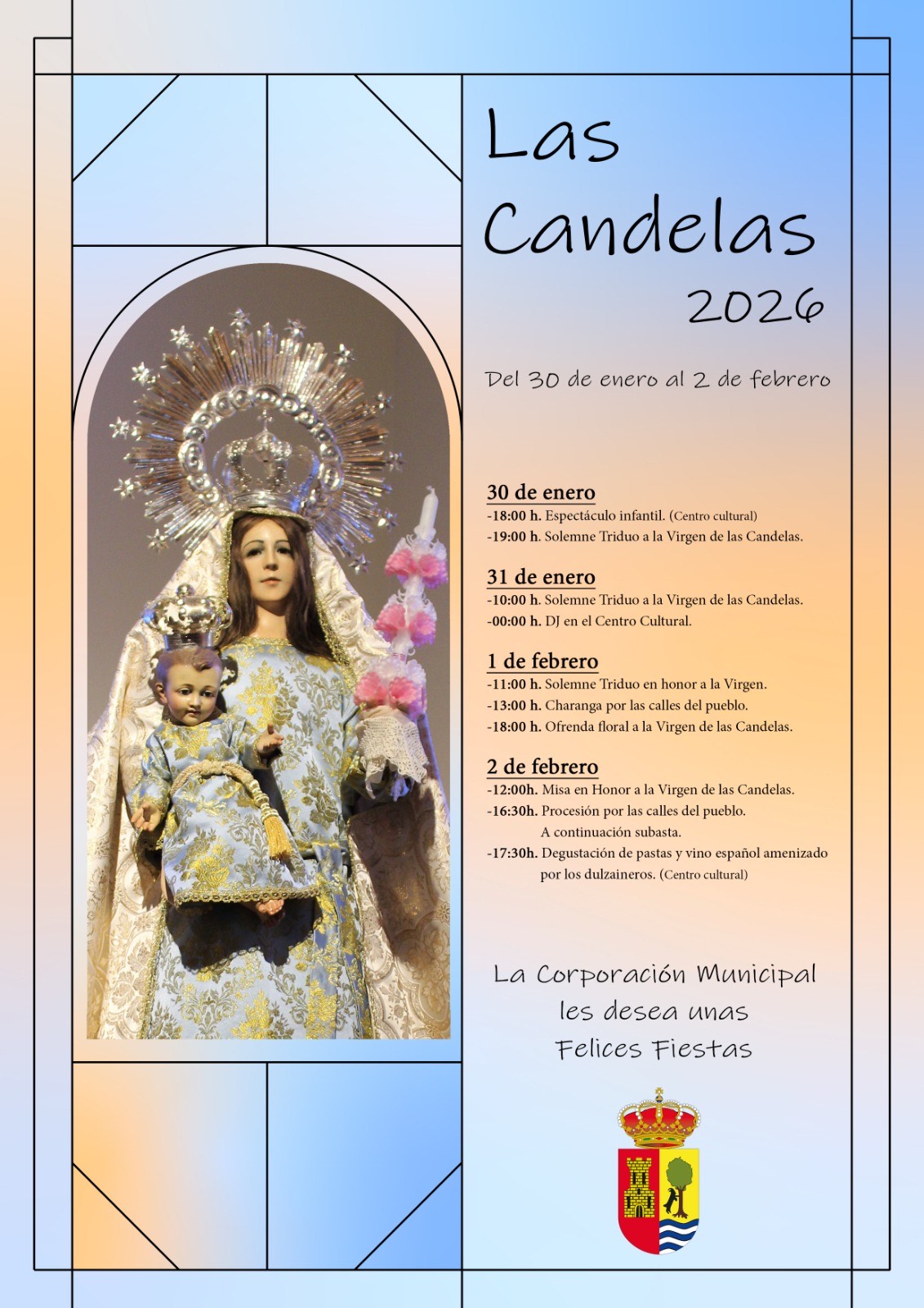Fiestas Las Candelas 20262026-01-23 18:57:17FiestasCon motivo de nuestra patrona, la Virgen de las Candelas, adjuntamos la programación para estos días festivos para nuestro municipio que transcurrirán desde el viernes 30 enero hasta el lunes 2 de febrero, día de la Virgen. Esperemos que las disfrutéis. ¡Viva la Virgen de las Candelas!