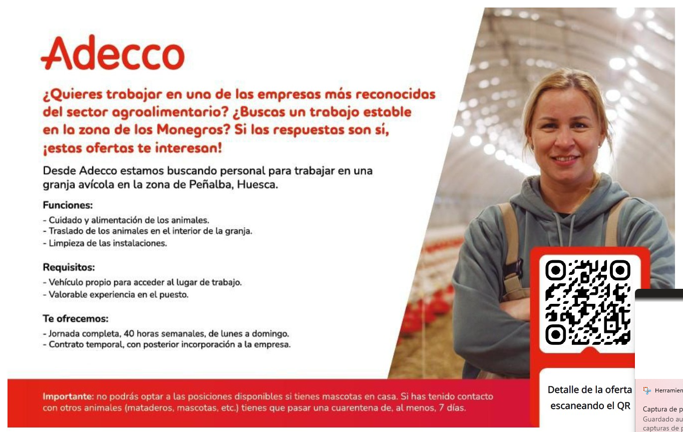 Oferta de trabajo operario/as de granja avícola en Peñalba. Estamos buscando 2 personas. También pueden enviar los currículums al correo: todoshuesca@adecco.com
