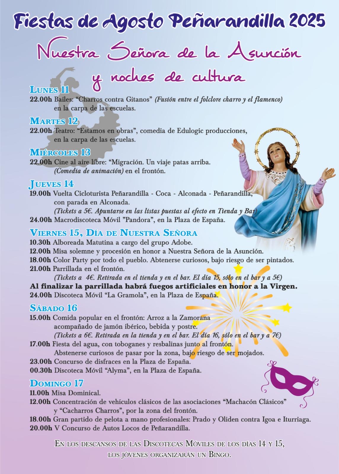 Del 11 al 13 de agosto, noches de cultura y del 14 al 17 de agosto, celebramos a Nuestra Señora de la Asunción con un programa lleno de música, tradición y diversión para todas las edades.