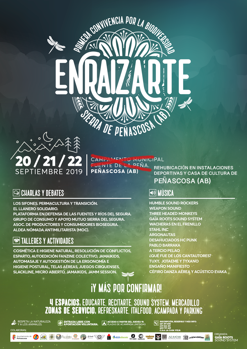 PRIMERA CONVIVENCIA POR LA BIODIVERSIDAD "ENRAIZARTE" PEÑASCOSA2019-09-19 08:37:09Cultura¡¡CAMBIO DE ÚLTIMA HORA!! Debido a las fuertes lluvias y tormentas que están previstas que se sucedan el fin de semana de las convivencias, desde la organización hemos decidido reubicar el encuentro para mayor seguridad y tranquilidad de todas y todos los asistentes. En vez de en la localización original, el evento se llevará a cabo en el propio pueblo de Peñascosa, rehubicando los espacios y zonas de servicio con la misma programación entre las pistas polideportivas, la casa de cultura y una zona habilitada para la acampada. Gracias por la atención y disculpar las molestias. ...Nos vemos en Peñascosa!